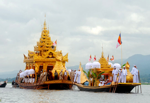 You’ll head to the center of Inle Lake in your private vessel, passing floating garden houses built on stilts inhabited by the local Intha People, and the famous ‘leg-rowing’ fishermen who make their living from the lake’s plentiful supply of fish. Continue to the lake’s main Buddhist site, the Phaung Daw Oo Pagoda, home to five small gilded images of Buddha. The statues, which range in size from nine – 18 inches, are essentially solid gold and have been so covered in gold leaf during merit-making that their shape is no longer determinable.
