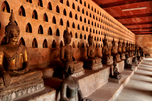 Arrival at Vientiane, visit the Wat Si Saket, was built in the Siamese style of Buddhist architecture, with a surrounding terrace and an ornate five-tiered roof, rather than in the Lao style.