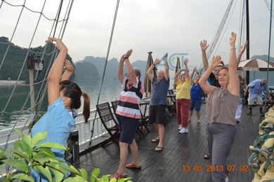 Greet the day with a morning Tai Chi exercise with an opportunity to view the sunrise over the bay. Sitting on the upper desk we can enjoy the breath - taking beauty of the rocky islands rising from the crystal-clear water of the bay. We can hear the birds singing, cicadas chirping ashore and the gentle lapping of the waves against our boat, the perfect soundtrack to accompany the fresh air and gentle breeze.
