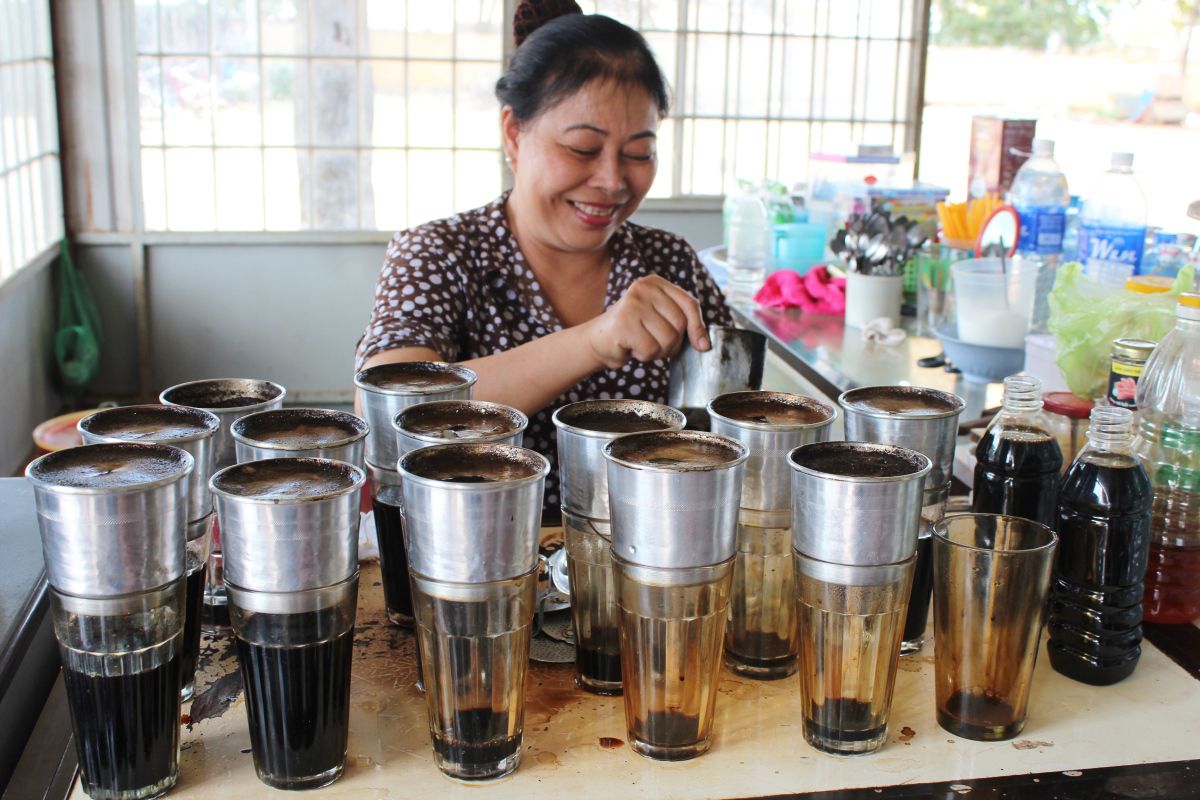 After being roasted, often with a small amount of butter to enhance depth and aroma, coffee beans are finely ground and placed into the phin. Hot water is then poured over the grounds, allowing the coffee essence to drip steadily into the cup below. The process takes several minutes, creating a moment of pause rather than speed. When enough coffee has collected, drinkers can add sugar or condensed milk before gently stirring and enjoying the result.
