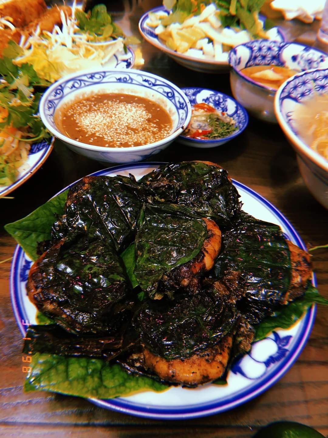 The shrimp mixture is seasoned, shaped, and delicately wrapped in aromatic betel leaves before being grilled over charcoal. As the rolls meet the fire, the leaves release a fragrant herbal aroma while the shrimp turns lightly charred on the outside, locking in its juicy sweetness within.