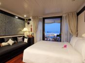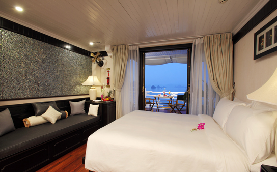 Two Grand Deluxe Cabins offer passengers stunning views of Halong Bay through their panoramic windows. Each cabin is 20 square meters, including an en-suite bathroom and handcrafted furniture. As with all our cabins and suites, the sense of space and luxury is enhanced by the elegant décor and minimal style.