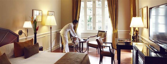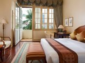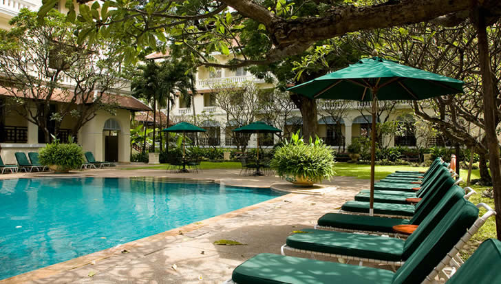 Raffles Hotel Le Royal’s rooms, suites and apartments are all in colonial style, with wooden floors and overhead fans, and recently refurbished using local artworks and fabrics.