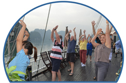 Greet the day with a morning Tai Chi Exercise with an opportunity to view the sunrise over the bay. Sitting on the upper desk we can enjoy the breath - taking beauty of the rocky islands rising from the crystal-clear water of the bay. We can hear the birds singing, cicadas chirping ashore and the gentle lapping of the waves against our boat, the perfect soundtrack to accompany the fresh air and gentle breeze.