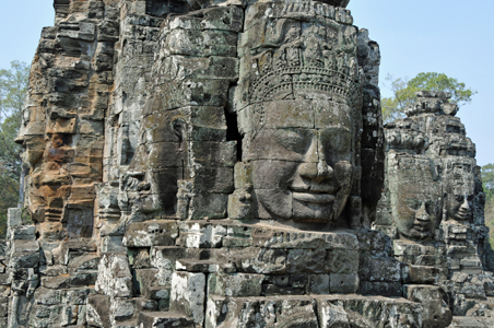 We then visit the fortified Royal city of Angkor Thom, constructed by King Jayavarman II at the end of the 12th century, not long after the completion of Angkor Wat. It is surrounded by a massive perimeter wall and a moat with five monumental gates and covers an area of more than ten square kilometers, indeed Angkor Thom means ‘Great city’. The most important monuments are located in the center of the city, namely the Bayon, Baphoun and the Terrace of Elephants. The Bayon in particular is a fascinating piece of architecture and one of the most photographed. It is a bizarre structure, with a total of 54 towers elaborately decorated with over 200 enigmatic smiling faces.